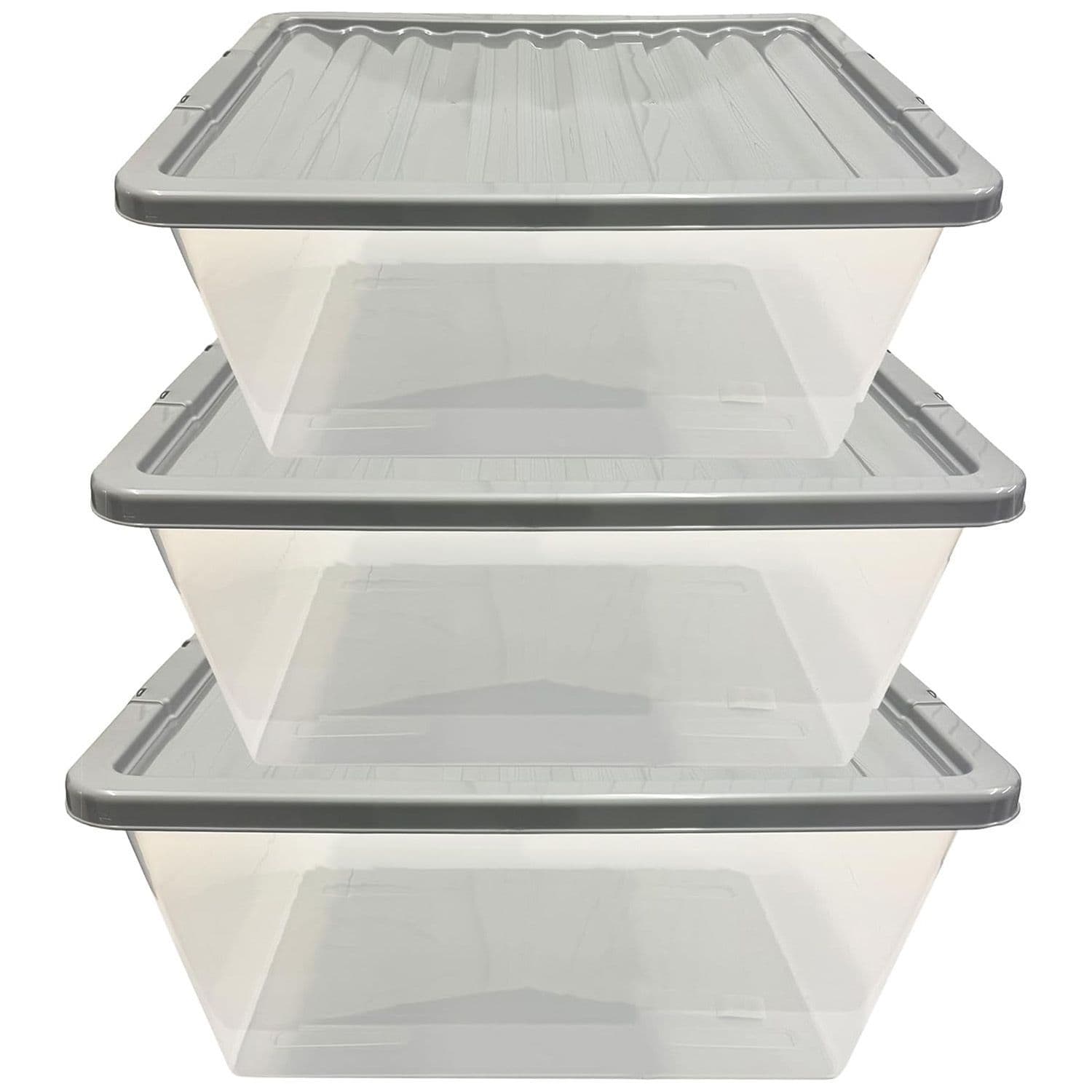 Measurements: 62 Litre Capacity. Pack of 3 Clear Containers With Silver Lids.