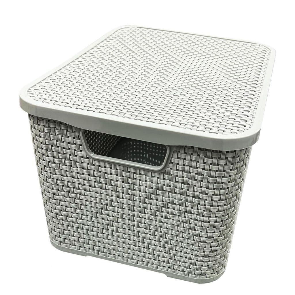 - LARGE BASKETS IN GREY & CREAM: Large storage basket for all around the home. Offers the attractiveness of a natural woven look with the hard-wearing, easy to clean qualities of plastic. This lovely rattan wicker effect design storage box is great for every application, whether you are storing socks under the bed, you can keep your valuable items securely out of the way, but handily close by. The rattan design is beautiful for your home and office.